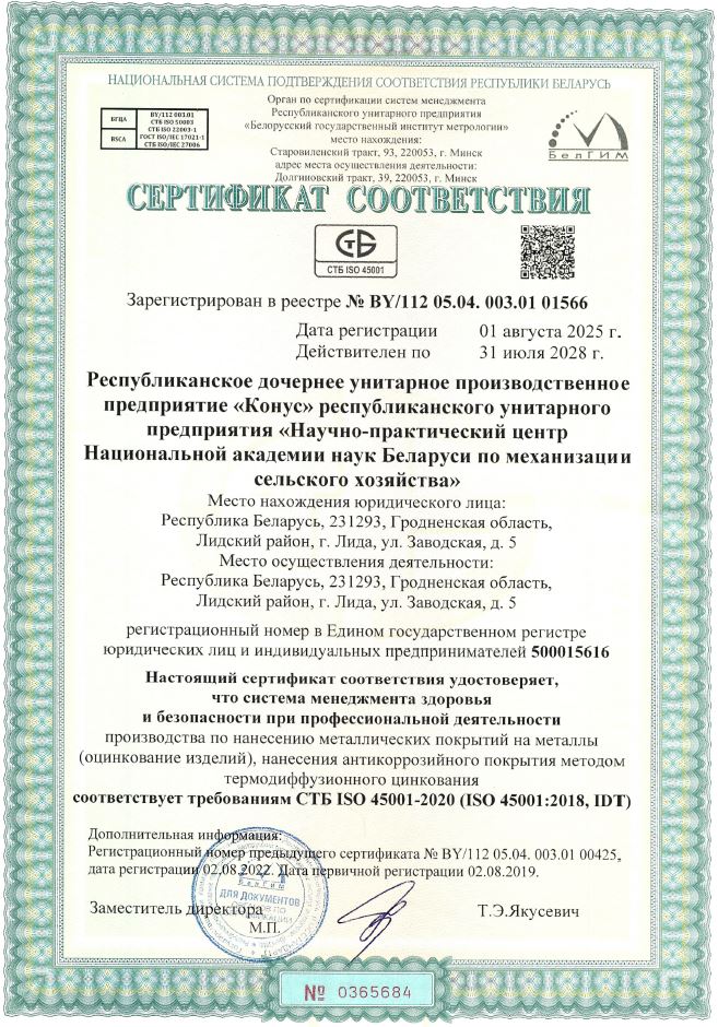 сертификат соответствия СМЗБ требованиям СТБ ISO 45001-2020 (ISO 45001:2018)